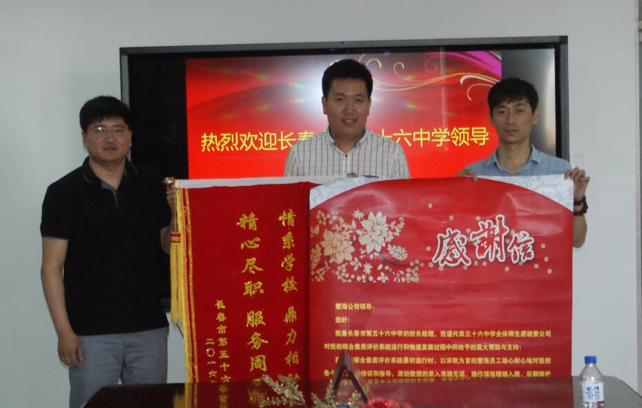 進(jìn)入驕陽似火的七月,我公司再傳喜訊。7月13日,長春市第五十六中學(xué)副校長柳鑫代表學(xué)校來到慧海科技,專程將感謝信與錦旗送到我公司,特別向我公司實(shí)施部員工宋凱對五十六中學(xué)素質(zhì)教育綜合評價系統(tǒng)運(yùn)行和快速發(fā)展過程中給予的幫助和支持表示感謝。